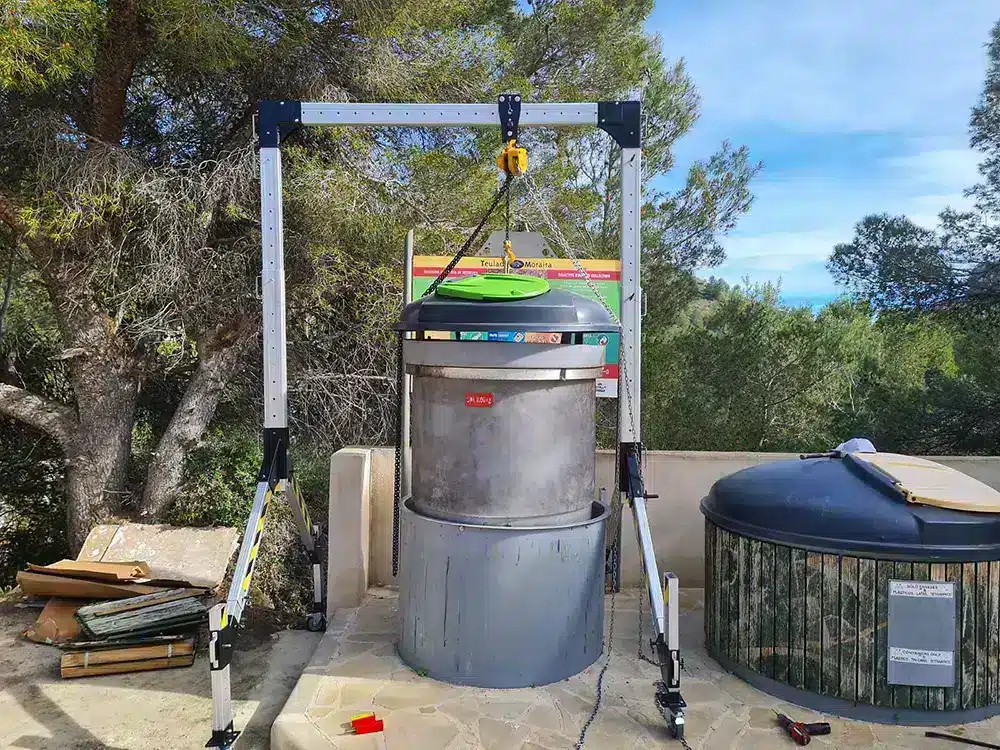 La carga máxima soportada por el pórtico de elevación son 1.000 kg cuando se encuentra replegado y hasta 500 kg en cualquier posición de despliegue. Incorpora equipo de protección individual contra caídas para realizar el trabajo de forma segura.